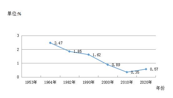 全省常住人口中,文盲人口(15岁及以上不识字的人)为1088905人,与2010年第六次全国人口普查相比,文盲人口减少308942人,文盲率由3.74%下降为2.75%,降低了0.99个百分点。