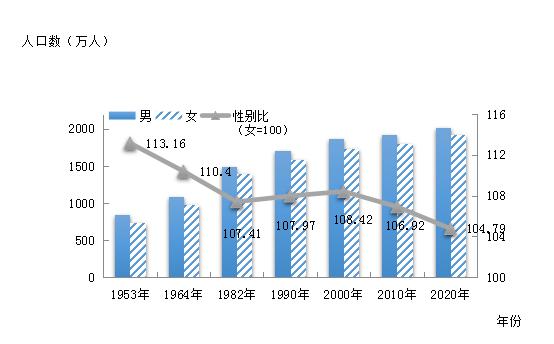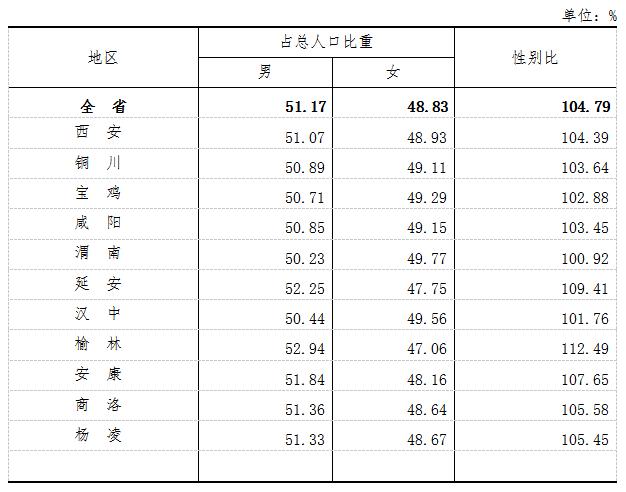 全省常住人口中,男性人口为20226490人,占51.17 %;女性人口为19302509人,占48.83 %。总人口性别比(以女性为100,男性对女性的比例)由 2010年第六次全国人口普查的106.92下降为104.79。