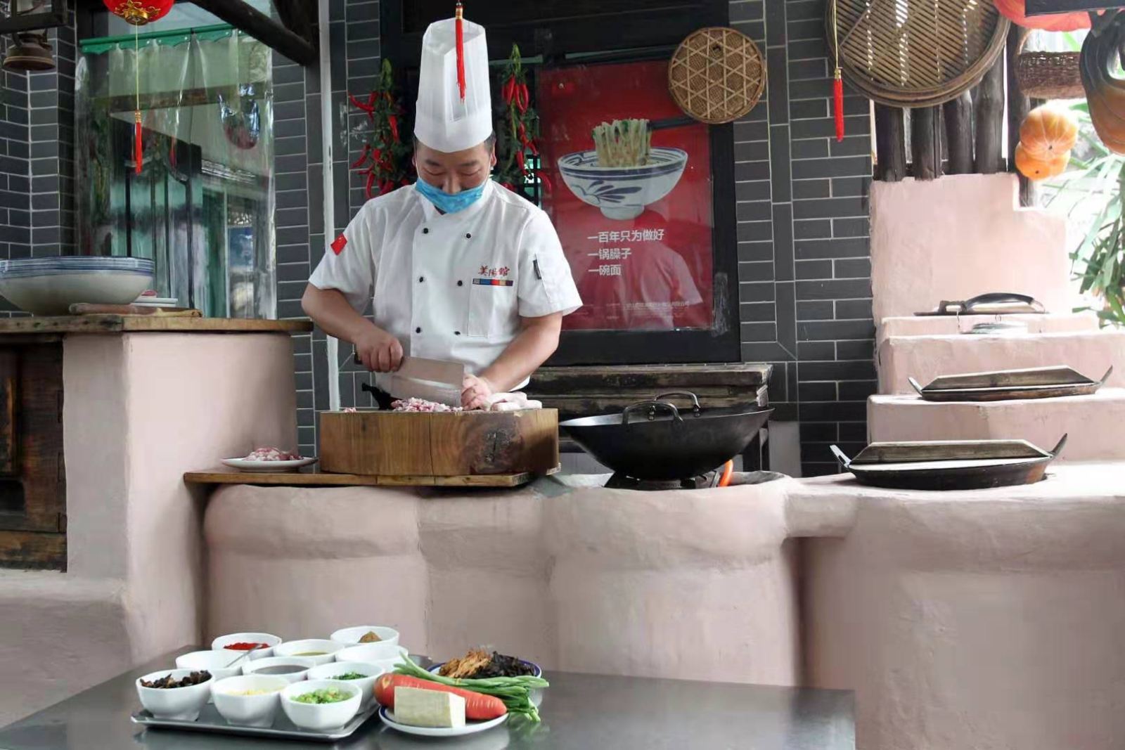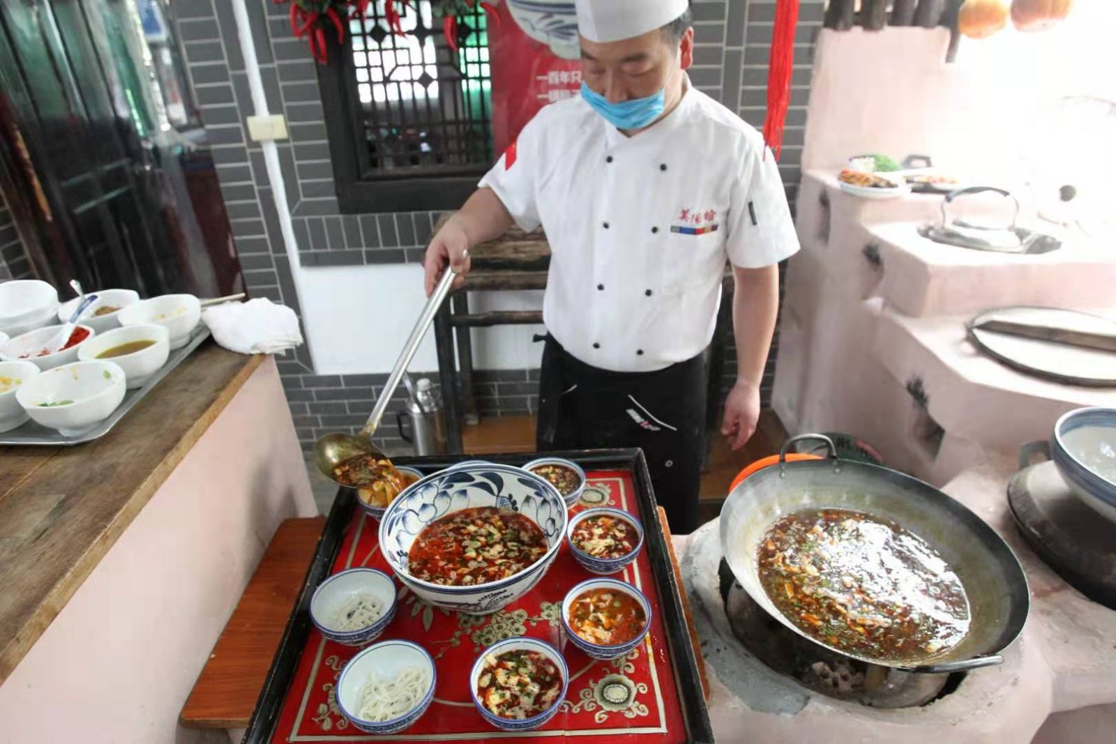 木耳、豆腐、蛋皮、黄花、蒜苗、胡萝卜……色泽鲜艳的食材纷纷入汤菜,大师傅熟练地操持着手中的锅铲,根据热锅的臊子和菜的比例,控制着油和辣味合适,仿佛在雕刻一件精致的手工艺品。