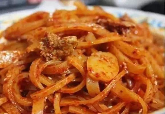 岐山擀面皮:擀面皮筋道、柔软、凉香、晶莹剔透,可切片,可切条,同油泼辣子、盐水、香醋、大料水等调料加以调和,酸辣可口。