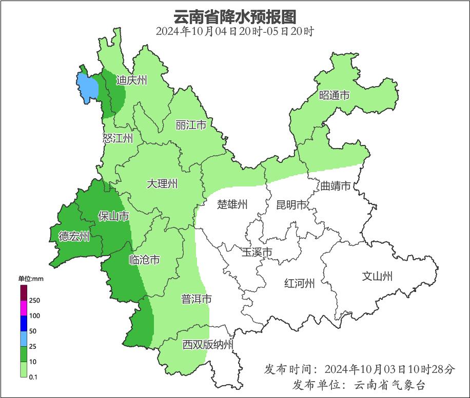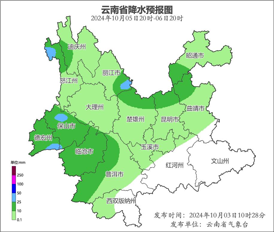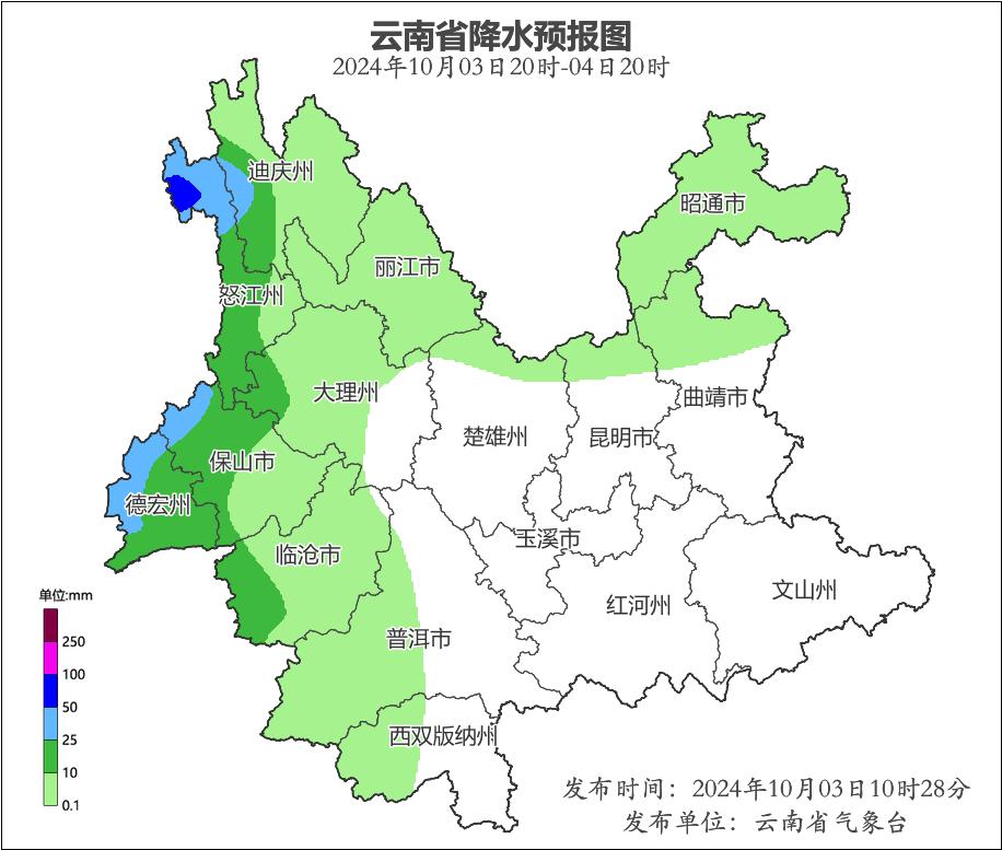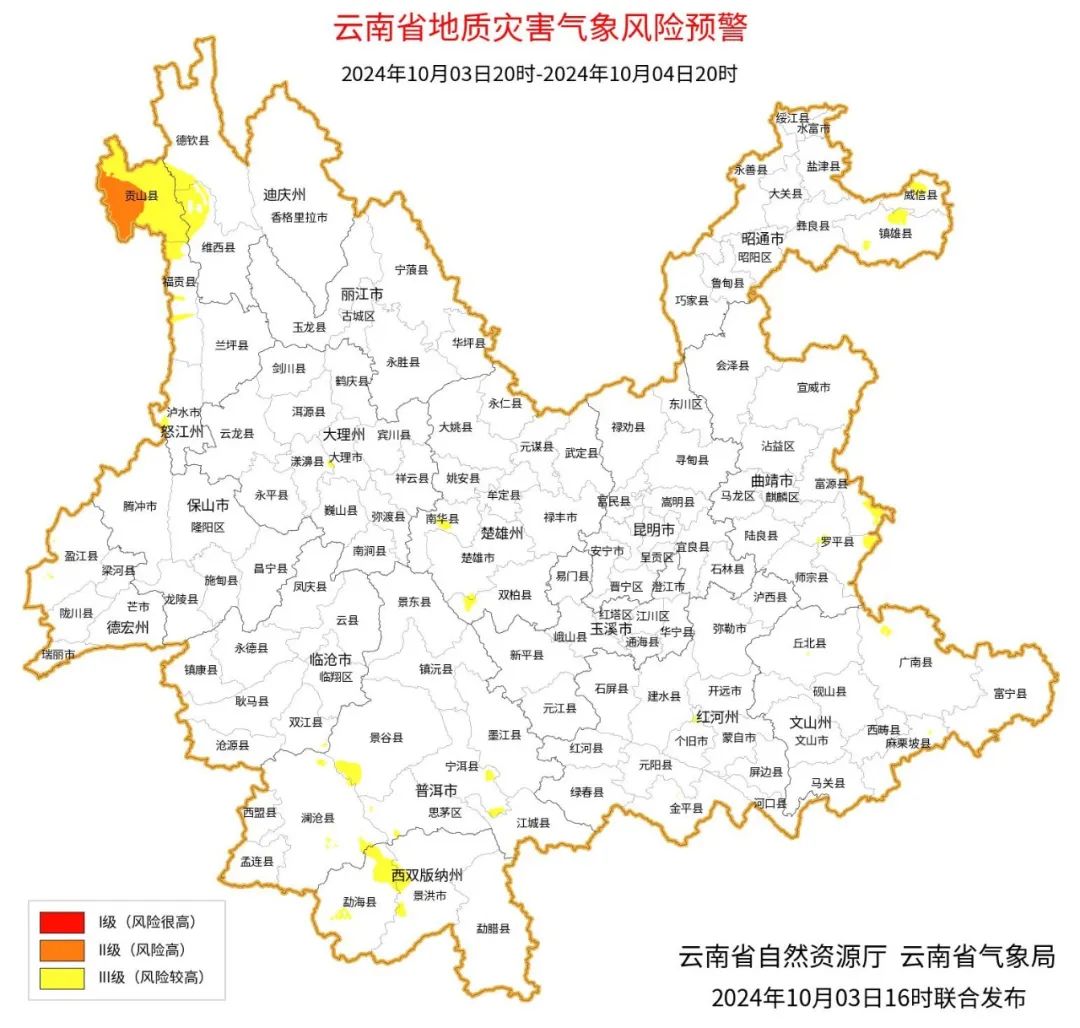 10月3日20:00至10月4日20:00,怒江州贡山县发生滑坡泥石流的风险高;楚雄州南部,怒江州西北部、南部,大理州中部,临沧市东南部,普洱市南部,红河州中部,文山州北部,曲靖市东部,昭通市东部发生滑坡泥石流的风险较高。