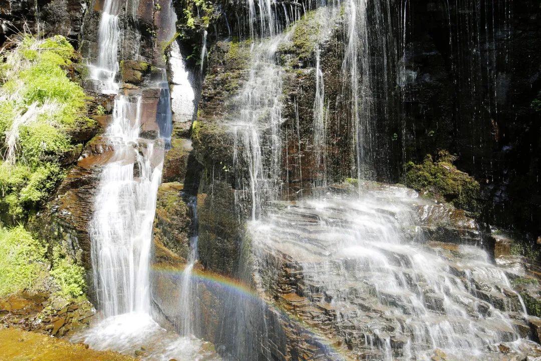 锦江瀑布也叫梯子河瀑布,总落差约70米。瀑布两侧的峭壁上奇松怪石多,瀑布下是高低起伏的高原大草甸。