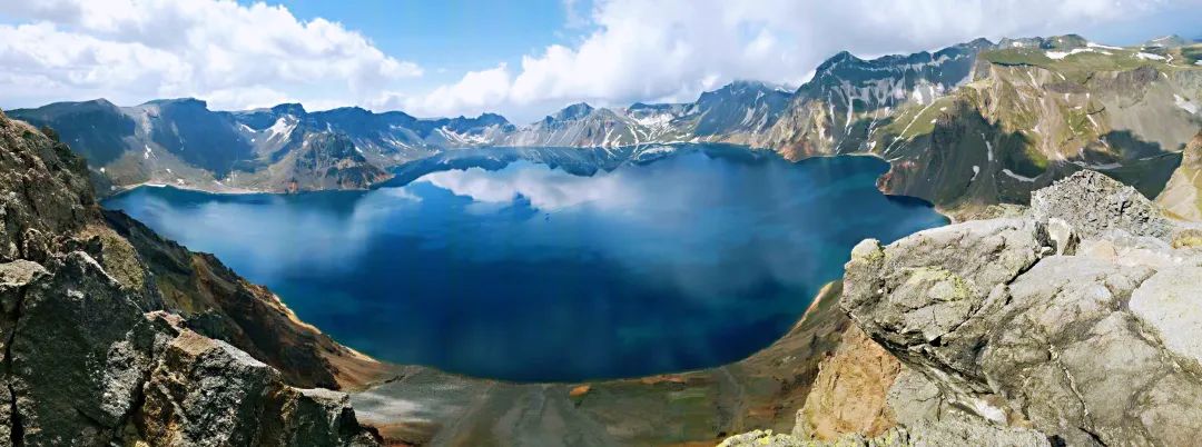 看天池视角:南景区离天池最近,此处天池周边地势较为平缓,风势较小,夏季野生花草铸成天然花园,十分秀美。天池在此展示得更加完美、恢弘,登顶可见满月形湖面,由于无山峰阻挡,在南景区看天池,侧立面高深、视野宽广,全景天池一览无余。