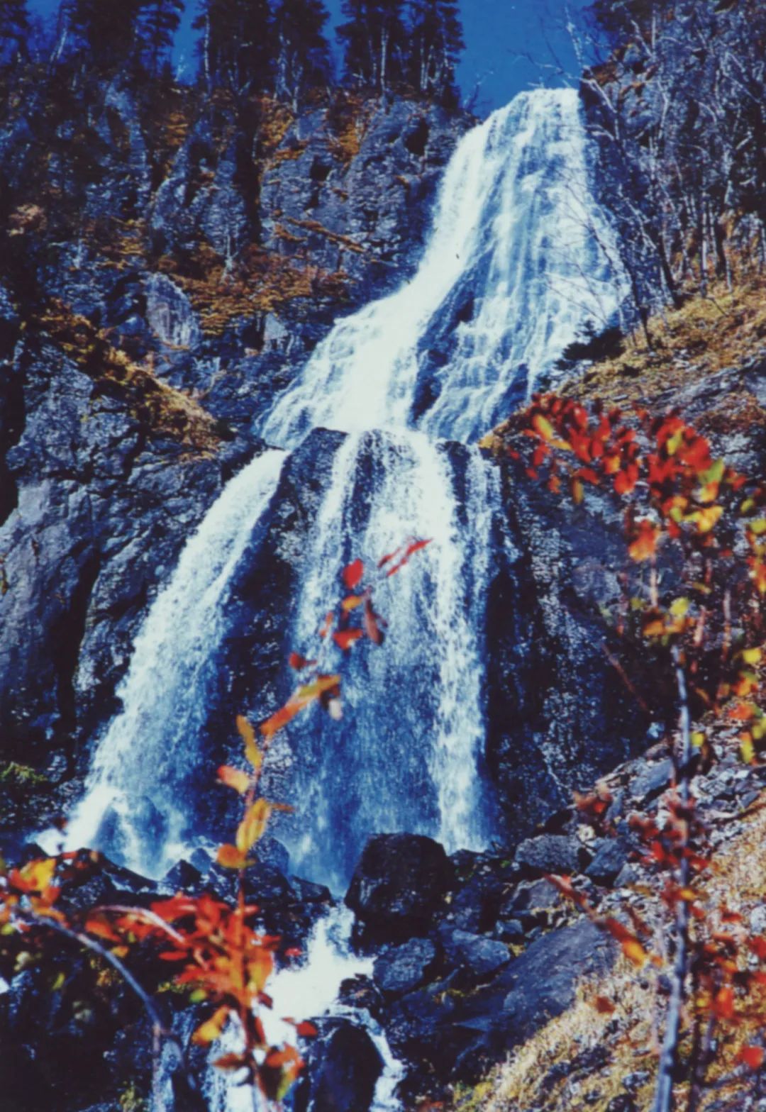 虎跳峡瀑布由4级奔泻跌落构成,这是长白山瀑布群体跌落最多层的瀑布。