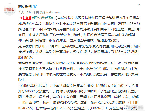 转机出现在9月13日晚,中铁西安局微博“西铁资讯”发布消息,宝成线灾害区段山体表层防护工作全部完成,根据抢险加固工程现状,铁路部门将于9月20日零时起对宝成线列车运行图进行调整。调整后,除“秦岭小慢车外”,宝成线(宝鸡至广元间)还将开行北京西往返成都;扬州往返成都;成都往返佳木斯等多趟列车。