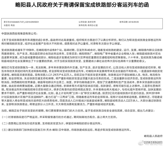 这份成文于8月28日,向中铁西安局发去的函称,我们认为取消宝成铁路全部客运列车将对略阳脱贫攻坚、经济社会发展产生极大不利影响,请贵局对此予以重视,对原有车次部分予以保留。
