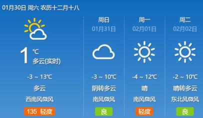 ▲陕西省气象台预计,受高原槽东移影响,30日-2月1日关中、陕南云量增多,陕南南部有弱降水,陕北北部有吹风天气。西安周末最低气温-1 ℃,最高气温在10 ℃左右,晴暖的周末,很适合外出逛逛。