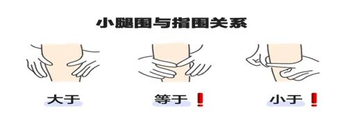 AWGS2019(亚洲肌少症诊断及治疗共识2019版)建议,小腿围界值:男性<34 厘米、女性<33 厘米,对诊断肌少症有参考价值。如果手边没有软尺,可以用自己双手食指和拇指环绕围住小腿最粗的部位。如果指环围度与小腿围刚好合适或略大,则患肌少症的风险就会增加。