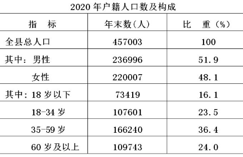 年末全县共有9个镇,101个行政村,15个社区居委会。共有户籍人口457003人, 其中:男性236996人,占51.9%;女性220007人,占48.1%,男女性别比为107.72。全年出生人口3291人,出生率为6.85‰;死亡人口2481人,死亡率为5.17‰;人口自然增长率为1.68‰。0-17岁抚养系数为26.8%,比上年上升0.2个百分点。表三