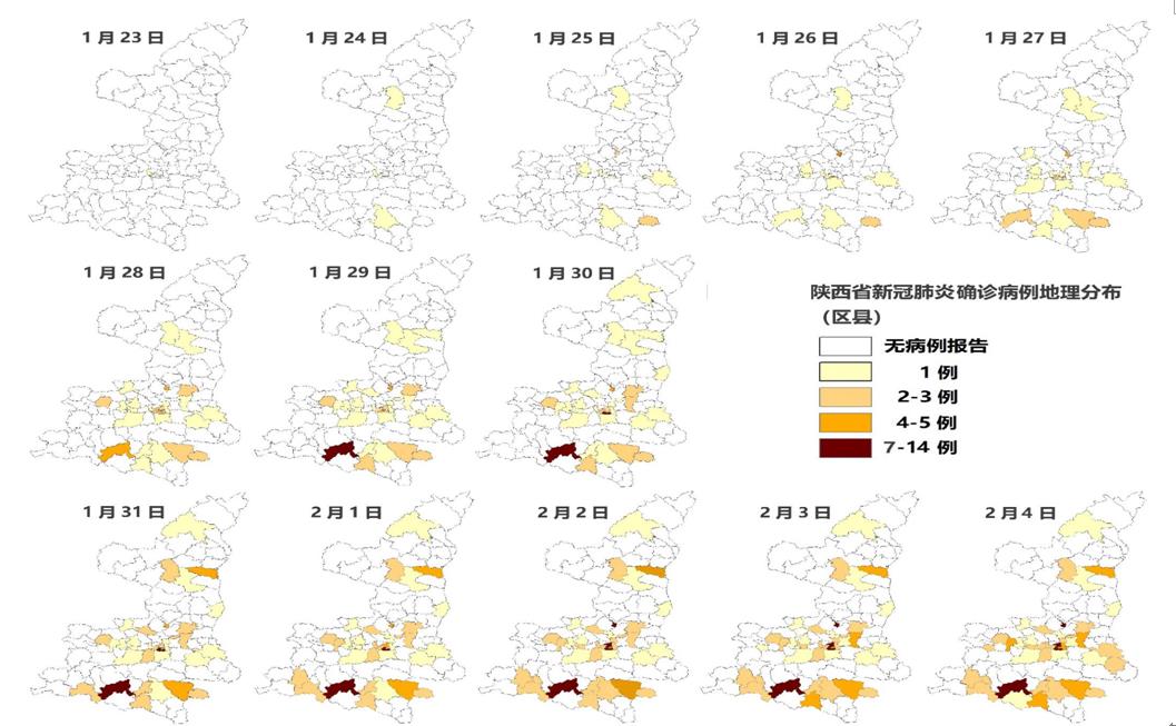 随着时间推移,陕西省累计确诊人数不断增加,波及地区逐渐扩大分布较广,存在区域聚集性特征,各区县病例分布呈现点状分布特点,暂未出现县区间的传播,提示陕西省总体防控措施有效。