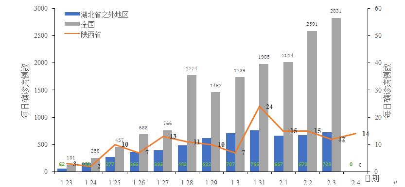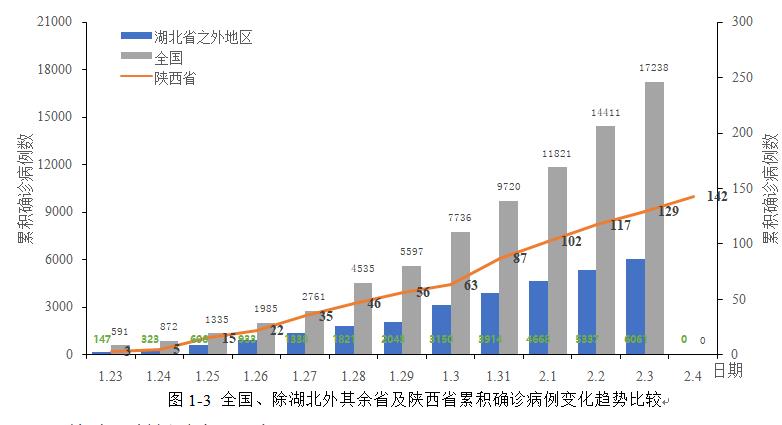 将全国、陕西省和湖北省之外地区每日新增确诊病例数比较,可以看出陕西省每日新增确诊病例数与全国其余省份发展趋势大体一致。