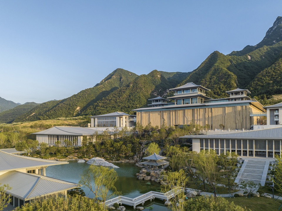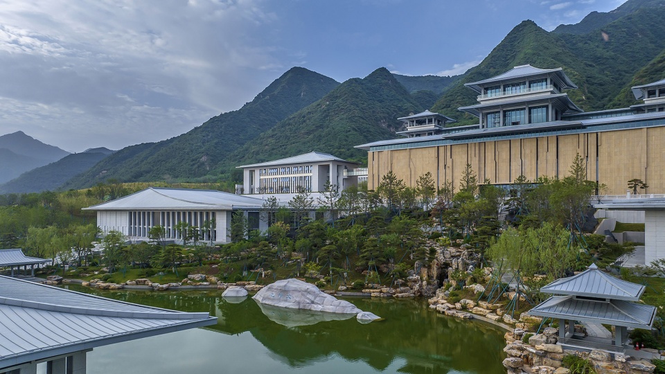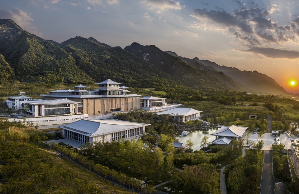 The project covers an area of about 300 mu, with a total floor area of 825,00 square meters. The overall layout takes full advantage of the towering and dangerous Guifeng mountain as the background. The axis of the project is led northward from the highest point of Guifeng, facing the open and flat Weichuan. The northwest has the Fengjing Ruins of the Zhou Dynasty, and the northeast has the Caotang temple built in the Eastern Jin Dynasty. The overall layout strives to be square, atmospheric and elegant, while adopting the community spatial layout of the Royal landscape gardens. On the highland of the southern section of the axis, pavilions are built on the high platforms. Buildings bring functional areas distribute on both sides are staggered one by one according to the changes of terrain. Finally, the buidings forms a structure of central axis symmetry and master-slave order, while corresponds to the harmony of the mountains. It also creates a poetic and picturesque atmosphere of clouds traversing the Qinling Mountains and Weichuan River in the north.