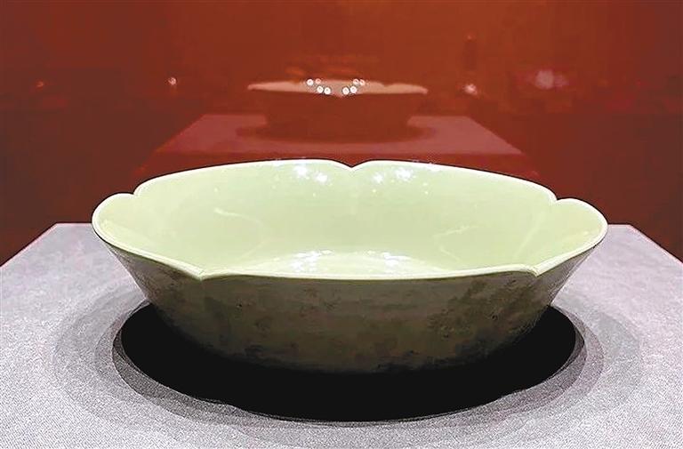 秘色瓷是唐朝晚期浙江越窑烧造成功的一种质量上乘的青釉瓷器,因其制作工艺秘而不宣而得名。唐五瓣葵口大内凹底秘色瓷盘,直径24厘米,瓷盘口沿五曲、腹壁斜收,曲口以下有凸棱,平底内凹,通体施青色釉,均匀凝润,盘壁有包装纸上的仕女图印痕,底外壁有支烧痕。此秘色瓷盘整体造型有如一张收口的荷叶,加上厚薄匀称的胎体和莹润可人的青绿釉色,呈现了“无中生有,似盛有水”的效果,为唐代官造专供宫廷使用之器。