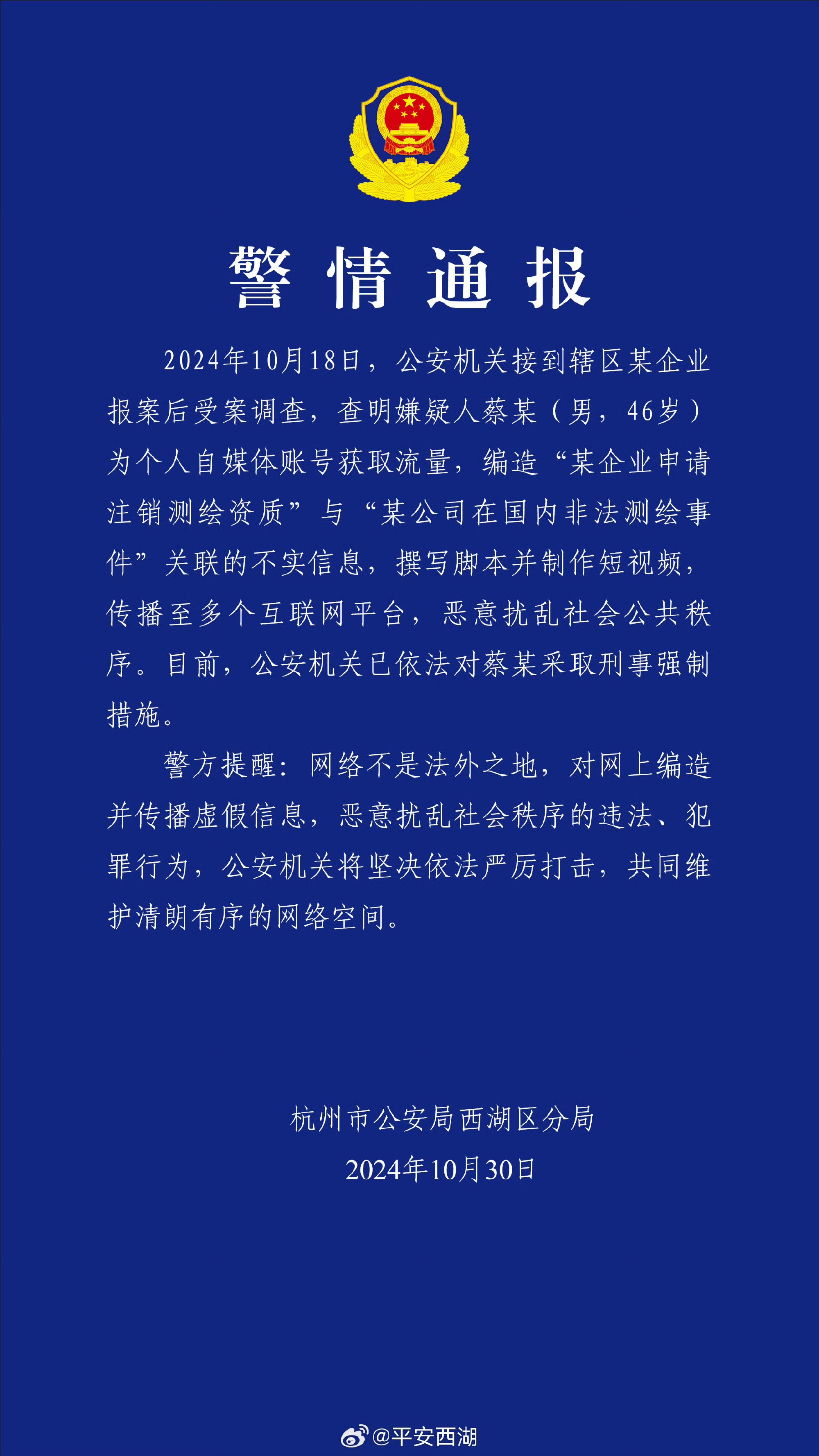 10月30日,杭州市公安局西湖区分局发布警情通报:2024年10月18日,公安机关接到辖区某企业报案后受案调查,查明嫌疑人蔡某(男,46岁)为个人自媒体账号获取流量,编造“某企业申请注销测绘资质”与“某公司在国内非法测绘事件”关联的不实信息,撰写脚本并制作短视频,传播至多个互联网平台,恶意扰乱社会公共秩序。目前,公安机关已依法对蔡某采取刑事强制措施。