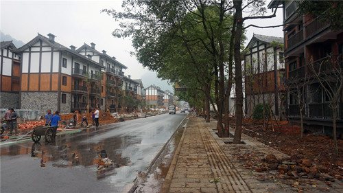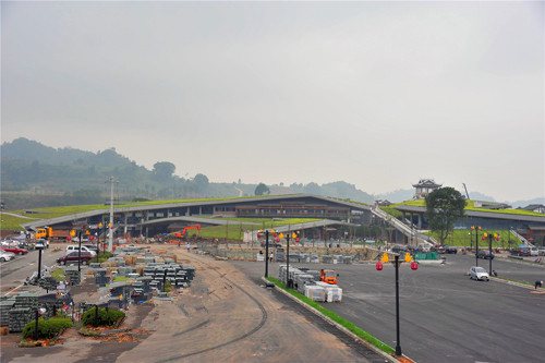 8月31日,在峨眉山门广场建设现场看到,施工人员正在加紧进行装饰、场地总平、绿化等工作,沿着项目现场一路走来,轰鸣的机械、穿梭的车辆、忙碌的人群交织成一幅热火朝天的施工图,现场既有火热施工的大开大合,也有艺术师傅的精雕细琢。据曹圣涛介绍,峨眉山门广场是度假区重要建设内容之一,占地88亩,建筑面积7.5万平方米,由峨眉山智选假日酒店、旅游购物、餐饮美食、主题客栈、风情酒吧等组成。项目建筑由北京设计院设计,景观设计由新西兰博发设计公司担纲,将屋顶打造成50亩绿地,使得建筑景观与自然环境融为一体。今后还会根据节庆活动需求将屋顶进行不同的景观打造。