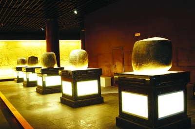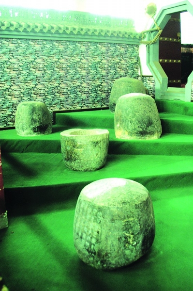 宝鸡石鼓园中陈列的石鼓仿品(真品收藏于北京故宫博物院)