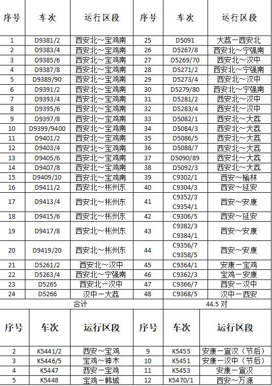 春运期间,为满足短途游旅客的出行需求,国铁西安局不断扩大省内铁路运能,通过加开、重联热门方向列车等多种方式提升运力,春运期间,共加开管内旅客列车56对,其中动车组列车44.5对,普速旅客列车11.5对。并对热门方向动车组列车实施重联运行,共重联动车组列车26列,全力满足不同旅客的出行需求。具体列车车次如下: