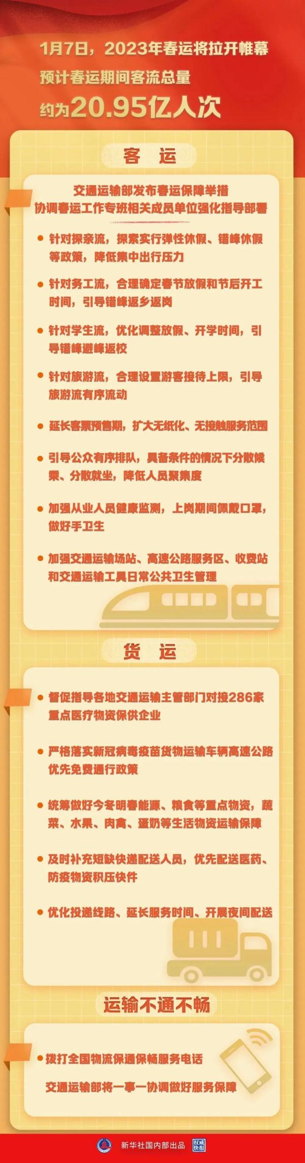随着“乙类乙管”措施加快落地,跨区域人员流动加速释放,加之疫情三年来人民群众累积的回乡过年、探亲访友、旅游观光等出行需求将集中释放,春运客流将从长期低位运行到快速恢复攀升,交通运输组织将从低负荷状态到满负荷运行状态。初步分析研判,春运期间客流总量约为20.95亿人次,比去年同期增长99.5%,恢复到2019年同期(29.8亿人次)的70.3%。