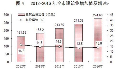 全年建筑业增加值274.69亿元,比上年增长13.8%(按现价计算)。年末全市具有资质等级的总承包、专业承包和劳务分包建筑企业159户,年平均从业人员10.72万人,增长17.2%。全年共签订合同额737.88亿元,增长18.3%。全年完成建筑业总产值637.03亿元,增长21.7%。