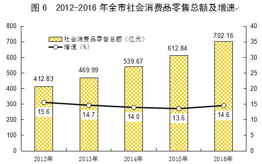 全年社会消费品零售总额702.16亿元,比上年增长14.6%。按销售单位所在地分,城镇消费品零售额635.10亿元,增长15.0%;乡村消费品零售额67.06亿元,增长10.8%。按消费形态分,商品零售额625.11亿元,增长14.8%;餐饮收入77.05亿元,增长13.0%。