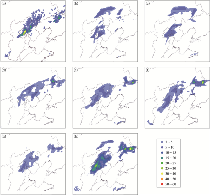 在短时临近预报时效内,模式预报误差很大程度上是由于初始分析场的不确定性造成的,集合预报技术在减小预报不确定性,提高模式预报技巧上已经得到了成功的应用和发展(; ; )。时间滞后集合订正预报技术最先由应用于中长期预报。近年来,许多研究人员已经开始将此技术用于短期时效预报,其原因之一就是短期预报的误差重要来源归咎于初始场的不确定性,而该技术可以解释为通过一系列不同的初始扰动条件得到的一组预报结果,各成员为不同起报时间、不同预报时效对同一时间点的模式预报结果,其作用与通过不同的初始场扰动获得的集合成员效果相似。此外,采用该方法进行模式资料后处理,不需要对数据进行过于复杂的计算,不会占用过多的计算资源,是一种高效节能的计算方案。这方面的工作,国内外的相关研究工作已经积累了一些经验。基于欧洲中期天气预报中心(ECMWF)模式,采用多元线性回归和多时效消除偏差平均方法建立单一模式的多时效集成订正预报,有效地减小了地面温度的预报误差。、、分别基于美国RUC(Rapid Update Cycle)模式、英国UM(Unified Model)模式、MM5(第五代中尺度模式)和WRF(Weather Research and Forecasting)模式的预报构建了单一模式或多模式时间滞后集合预报,并采用集合平均、集合最大值以及集合概率值获取6 h累积降水确定性预报及概率预报场。他们的结果表明时间滞后方法可以有效降低高分辨率模式的漏报率,提高模式的预报质量,尤其是针对漏报问题更为突出的高影响天气。基于华东中尺度快速更新同化系统,仅仅使用时间滞后集合平均和集合概率方法分别得到了小时降水量及概率预报,并发现小-大雨量级集合平均降水预报优于各集合成员,但集合平均暴雨预报不如部分集合成员。