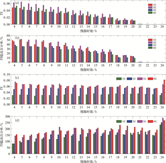 4 结果及分析 4.1 TS评分采用“点对面”的TS评分方法分区域对2017年8—9月小时降水量时间滞后集合订正预报及模式最新时次的预报(其起报时间为中的当前时刻H)进行对比分析。采用预报场及相应的实况场各区域内的第75百分位数作为检验阈值进行检验。