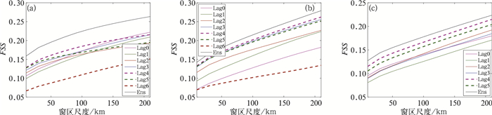 3.2 FSS检验许多研究表明,由于中尺度模式预报能够再现中尺度对流系统的结构和演变特征,模式水平分辨率的提高有利于定量降水预报准确率的提高。尽管如此,相比降水强度和降水形态,对于降水位置预报的差异仍是中尺度模式预报的主要误差来源().通常情况下,中尺度模式预报的降水系统会比实况时间上有若干个小时的偏差,空间距离上有几十千米的偏差()。