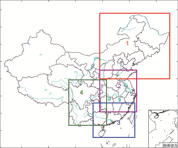 考虑模式对不同区域的预报性能有所差别,将我国中东部划分为北方、西南、华南及中东部大部地区等4个区域()。由于模式预报资料的获取较起报时间滞后3~4 h,以起报时间之后4 h的降水场为评分计算的实况场,分别计算每个区域落到站点上的时间滞后集合成员平均TS评分值,区域范围内评分高则该成员的权重系数大。4个区域外的预报值不做调整,选取最临近时次预报场替代,4个区域中相互重合区域的格点降水值取平均值。格点降水值P通过式(1)计算获得。