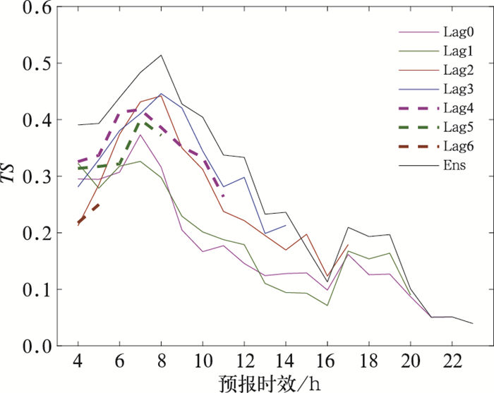 使用TS评分评估22日23时起报4—23 h预报时效内各集合成员(Lag0-6,Lag0为最新时次的预报,Lag6为时效最长的预报;以23时起报4 h时效的预报场为例,Lag0表示22日23时起报4 h时效的模式最新时次预报,Lag1表示22日20时起报7 h时效的模式最新时次预报,以此类推,Lag6表示22日05时起报22 h时效的模式最新时次预报)与集合订正预报结果(Ens)()。整体上,经过时间滞后集合订正后,各预报时效预报TS评分都高于单一成员,同时对于此次过程,预报员参考最临近的预报(Lag0)并不是最好的选择,Lag0-1预报评分整体上低于其他成员,集合方法为预报员自动挑选最优的预报成员,表现最为出色。虽然GRAPES-RAFS快速更新同化系统采用的是热启动技术,一定程度上缩短了模式的自适应过程,“spin-up”的影响也会在很大程度上得到抑制,但当前版本的GRAPES-RAFS热启动快速更新同化的可用资料有限,同时当前三维雷达反射率组网拼图资料是通过云分析模块并非是同化模块进入模式系统,这些都有可能影响热启动技术的效果,应该引起模式开发者和使用者的注意。