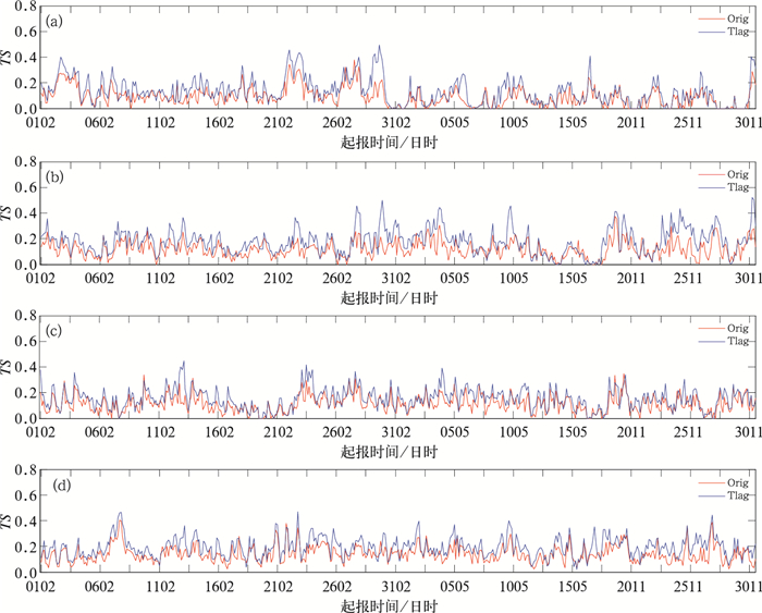 是8—9月逐日逐个预报时次6 h时效模式最新时次预报与集合订正后的预报TS评分对比。整体上看,经过时间滞后集合订正后的预报评分显著高于模式最新时次预报,其他时效预报评分对比结果与6 h时效结果类似(图略)。