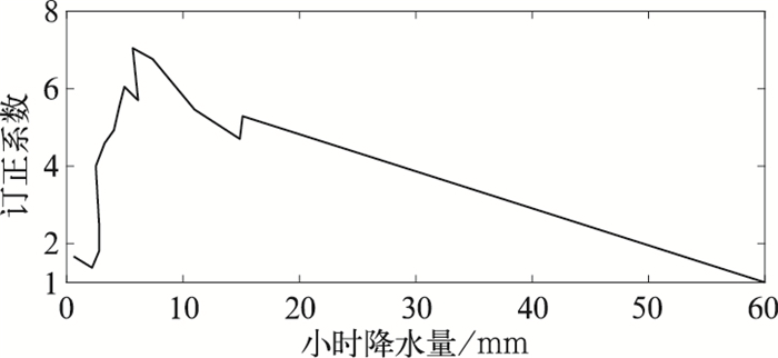 以为例,最新的模式预报资料起报时间为2017年8月1日23时,计算得到2区8月1日11—23时模式和实况的降水量频率分布(有实况资料的列入计算范围,没有实况的摒弃),在相同频率下,模式预报的降水量基本上都小于实况,表明预报与模式相比有明显的干偏差。计算不同阈值下相同频率的模式与实况降水量之比,得到一组降水阈值与对应订正系数的序列,考虑到降水过程存在强弱变化,因此该序列中降水阈值的最大值会存在差异,以60 mm为降水量的最终订正上限,相应的订正系数定为1,获取最终的降水阈值与订正系数序列。根据以上计算的这组各阈值上的订正系数,采用最邻近插值的方法获得对任何降水量的订正系数,用该订正系数乘以对应格点的预报值。以起报时间为8月1日23时为例,使用8月1日11—23时模式和实况的降水量资料得到的8月1日23时起报2区预报场订正系数随小时累积降水量变化曲线()。