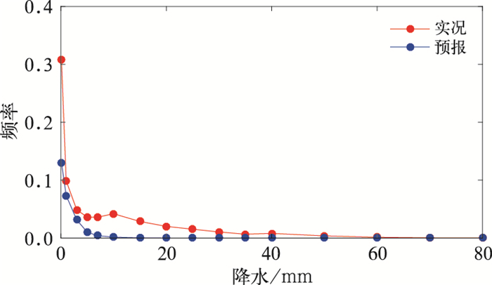 ${W_\mathit{i}} = \frac{{T{S_\mathit{i}}}}{{\sum\limits_{i = 1}^N {T{S_i}} }} $通过统计预报和实况前期在不同阈值条件下降水出现的频率发现(),对于GRAPES-RAFS模式,普遍存在小时降水量预报偏弱的问题。本文采用频率匹配订正法(; )对时间滞后集合预报结果再进行降水量级订正,即针对某一阈值,假定它在预报中出现的频率应该同实况中出现的频率一致,那么预报的降水量值应该寻求适当的系数以订正到同实况一致频率的降水量上,通过该方法可有效改善模式在降水量级上的预报偏差。