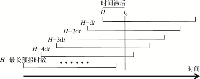 2 时间滞后集合和频率匹配订正方法 2.1 时间滞后集合方法虽然GRAPES-RAFS模式预报具备分辨大气中的中小尺度对流活动的能力,但其本身不可避免的具有一些不足。使用高频次的非常规观测资料对模式初值进行不断更新同化,可以得到更精准的模式初值,提高中尺度预报系统的预报准确率,但也带来了模式初始变量不协调而引发的初始平衡问题与误差累积问题,需要通过模式积分一段时间之后才能达到新的平衡,一般称这个过程为平衡调整(spin-up)过程()。时间滞后集合预报方法综合考虑不同起报时间不同预报时效对同一时间点的模式预报结果,选取不同的权重系数经过计算获得订正后的小时降水量预报值,可以有效地改善由于模式“spin-up”以及短时临近预报时效内初始分析场的不确定性带来的预报误差。此外,从主观预报角度出发,由于模式总在不断地调整更新中,通常预报员会主观对比不同起报时间预报场对所关注的时间点的预报准确度来剔除预报效果较差的预报成员,保留具有预报优势的成员,通过时间滞后集合预报计算,提供直接的订正降水预报产品,可以为预报员节约时间成本,提高预报效率。