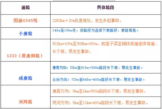 3、489KM-538KM(上行线洛塘至余家湾路段,桥梁隧道集中;阶州、强家湾隧道是事故多发路段)。
