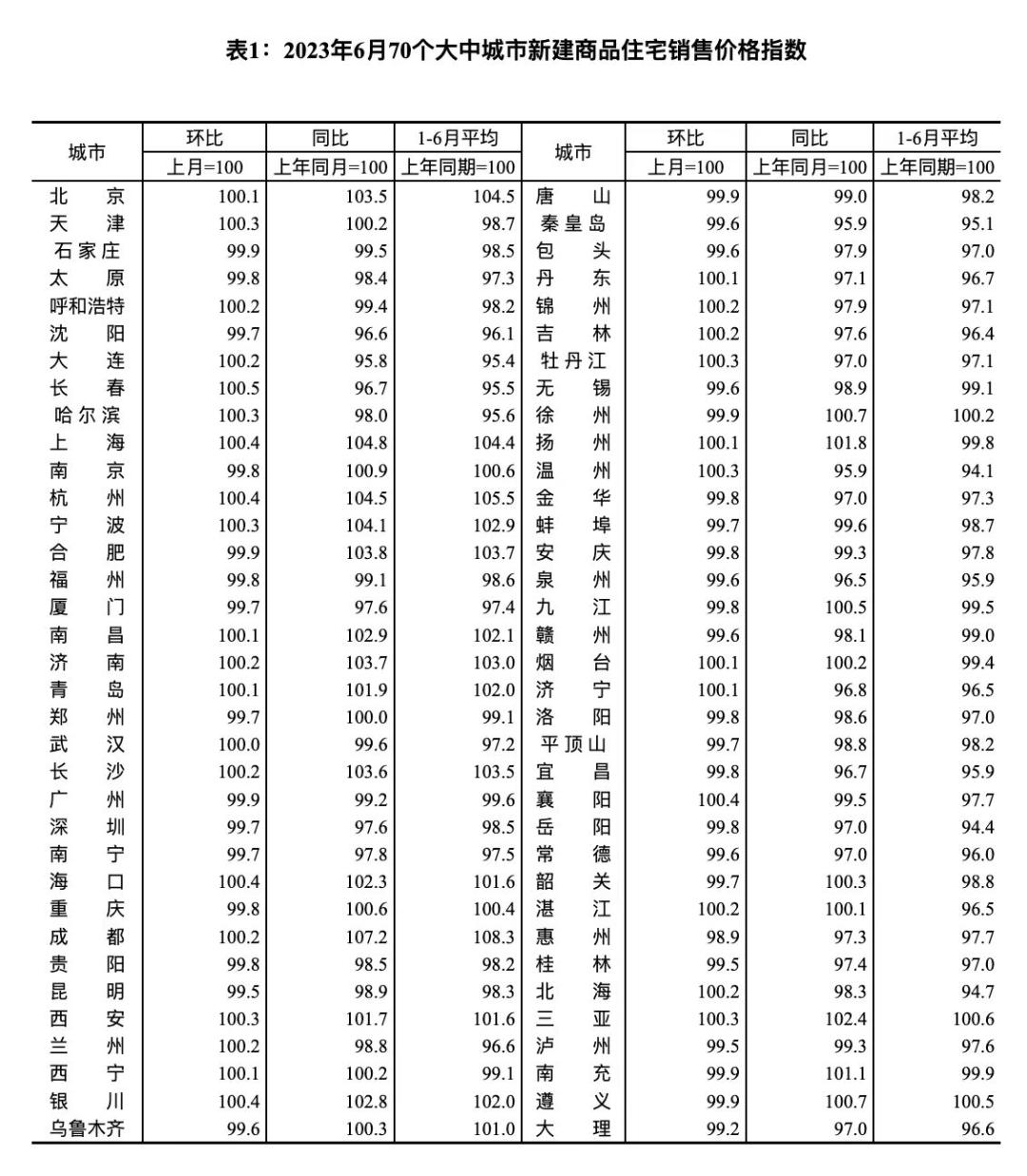 国家统计局城市司首席统计师绳国庆解读2023年6月份商品住宅销售价格变动情况统计数据称,2023年6月份,70个大中城市商品住宅销售价格环比上涨城市个数减少,各线城市新建商品住宅销售价格环比持平或略降、二手住宅环比下降;各线城市新建商品住宅销售价格同比有涨有降、二手住宅同比下降。