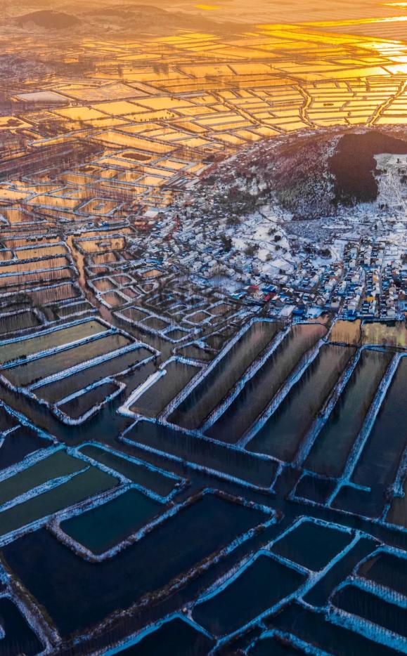 ▲ 徐州市柳泉镇套里村雪景,鱼塘间有河道进入微山湖。 摄影/李玉龙