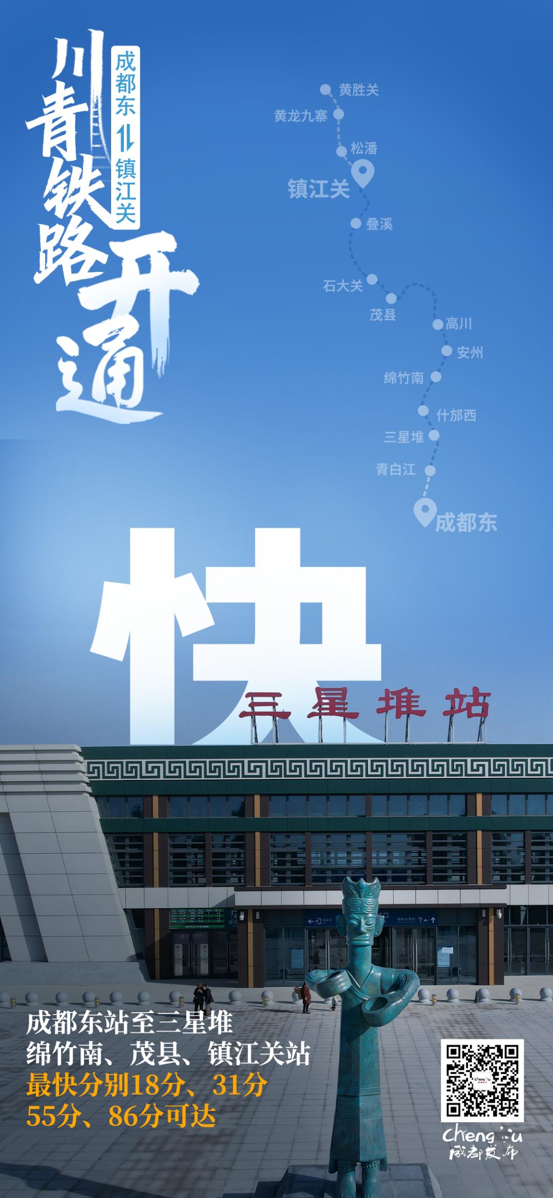 成都东站至三星堆站、绵竹南站、茂县站、镇江关站,最快分别18分钟、37分钟、55分钟、86分钟可达。