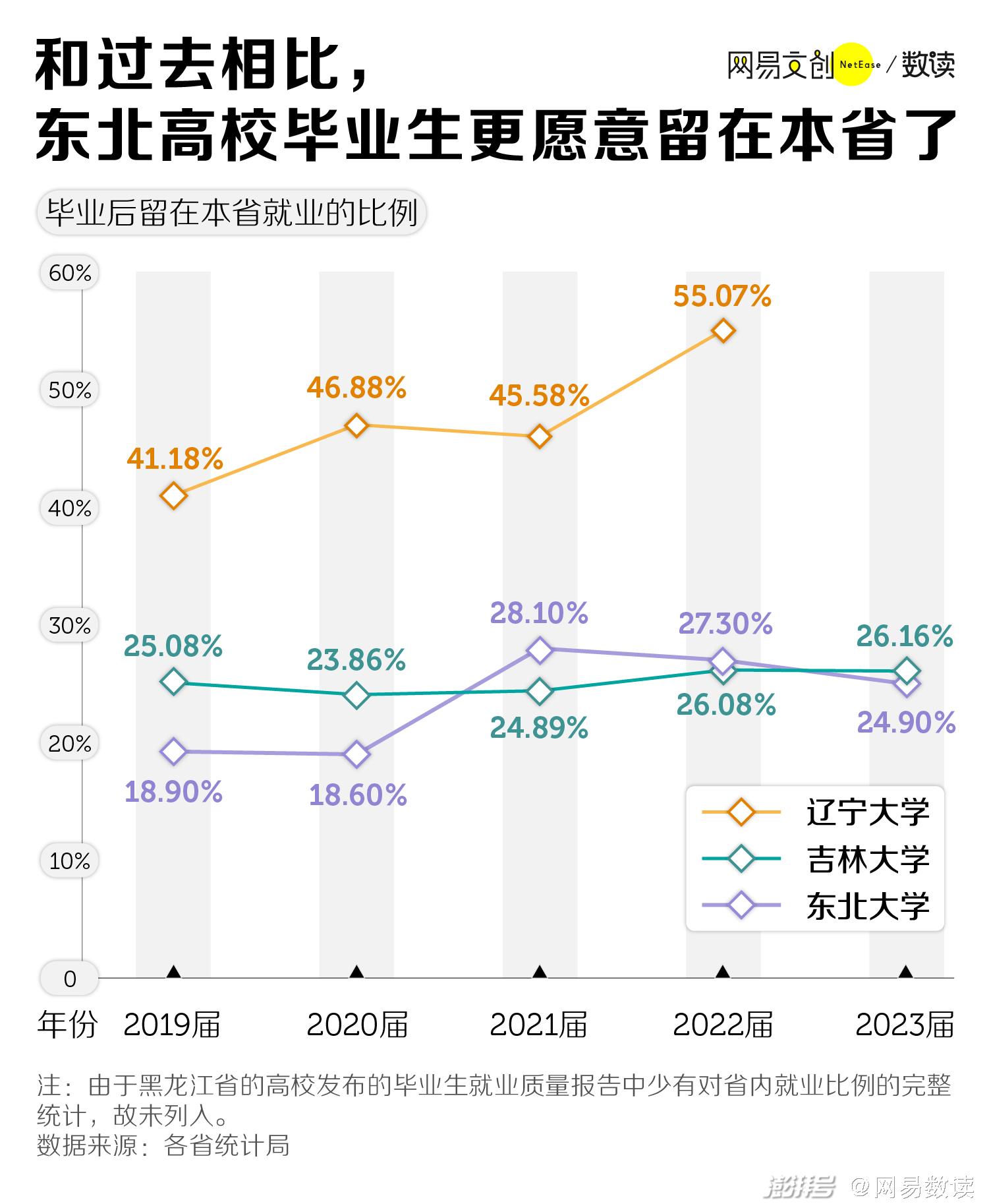一些东北高校的毕业生留在本省就业的比例也有提升。比如东北大学2023 届有 24.9% 的应届毕业生选择留辽,2019 年还仅有 18.9% [16][17]。老牌 985 吉林大学,2023 年也有约三分之一的毕业生留在东三省就业 [18]。