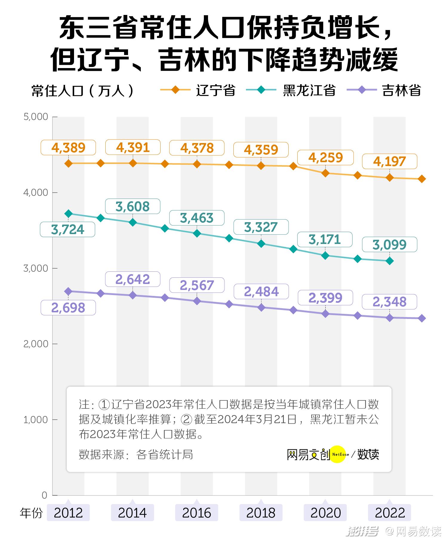 2023 年,虽然下降趋势较前三年有所减缓,但吉林、辽宁的总人口仍在不断负增长。