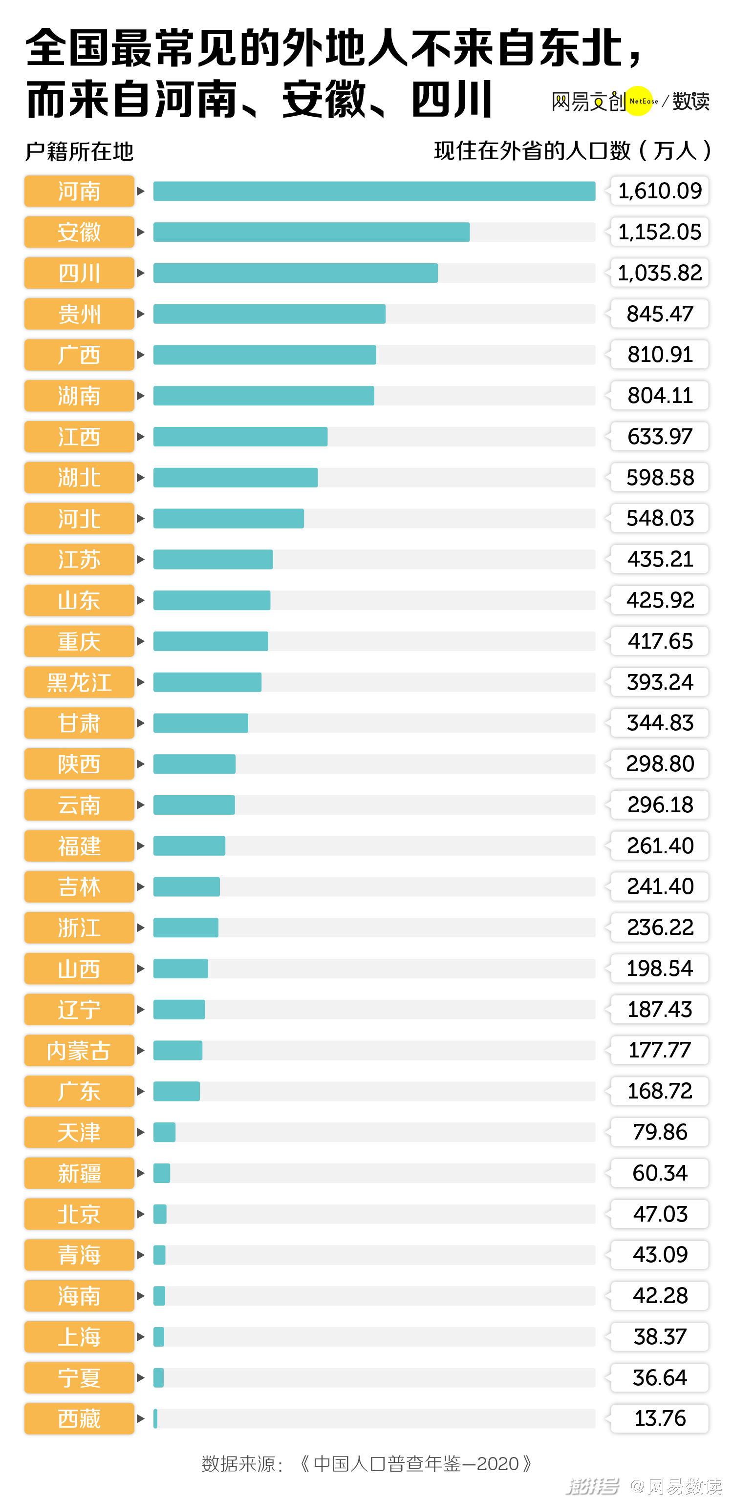 七普数据显示,全国住在外省、户籍却在老家的人里,最常见的分别是河南、安徽和四川人,三省在外漂泊的人数都在千万以上 [6]。