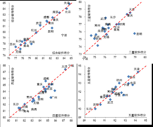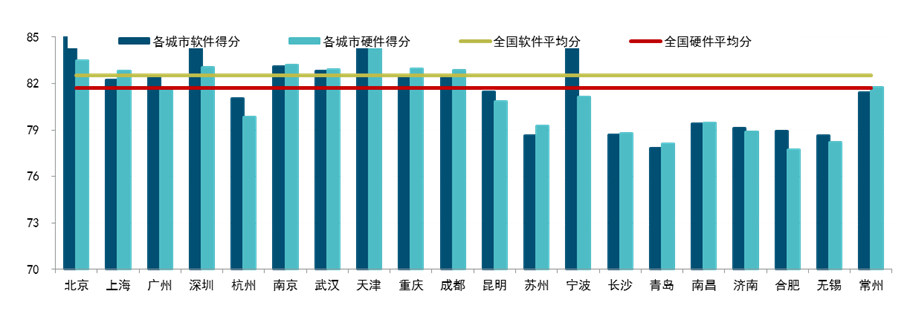 多数城市软硬件服务水平差距不大,深圳软硬件得分差绝对值较大。深圳软件得分分别比硬件得分高6.03分,为二十个城市中软硬件得分差绝对值最大的城市。主要原因为深圳硬件得分在二十城均值附近,软件得分明显领先,居二十城前列;其余城市软硬件得分差绝对值较小,除宁波、北京、合肥与杭州外,硬件得分与软件得分的差值为4.23、1.71、1.17和1.19,其余十五个城市软硬件得分差绝对值均小于1分,匹配程度较高。