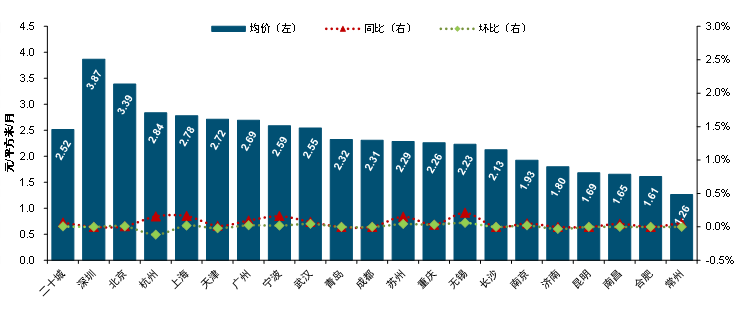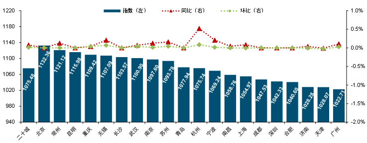指数:二十城综合指数环比基本持平,同比略有上涨,增幅较去年同期收窄0.30个百分点