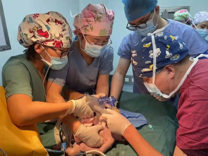无影灯下,在手术刀、止血钳的相互交错中,手术于下午5:25开始。术中,由于患者水肿严重,再加上产妇是二次剖宫产手术,大网膜和子宫、膀胱发生紧密粘连,但在专业团队的努力下,手术开始6分钟后即下午5:31将早产儿娩出。