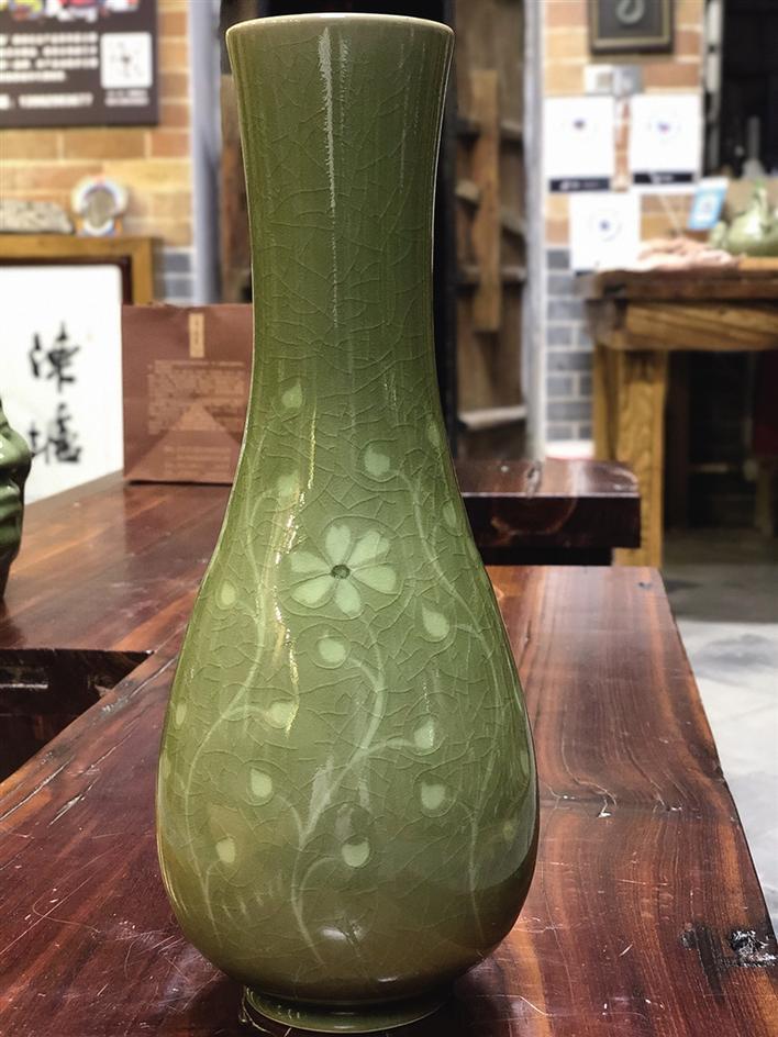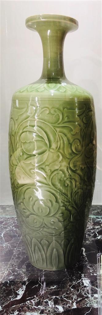 耀瓷刻花牡丹纹玉壶春瓶。记者 赵杨博 摄