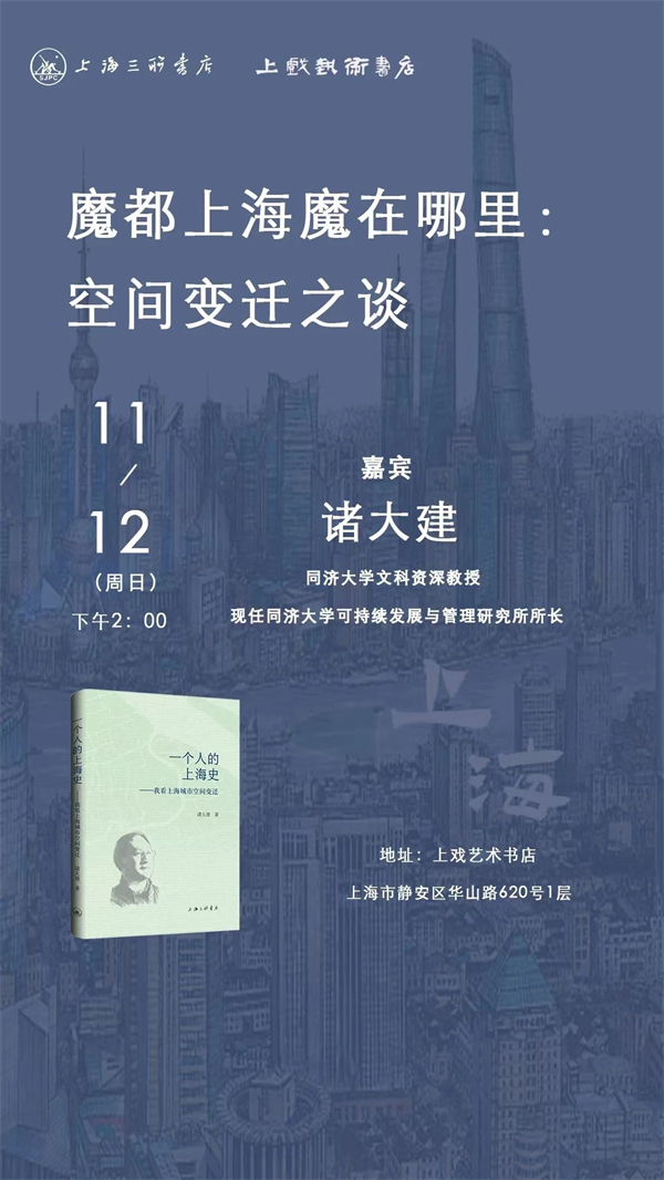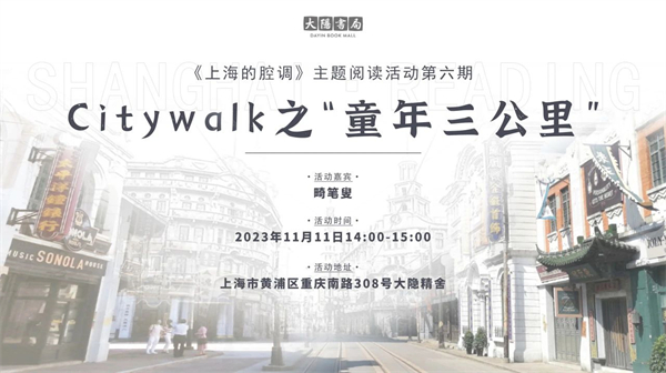 11月11日,在大隐精舍,畸笔叟老师带我们一起分享他的Citywalk之“童年三公里”,在他的娓娓道来中,我们会看见童年是如何在一个人身上落下斑驳却又美好的痕迹,看到他对儿时和家人的思恋,在至情至性的讲述里,也许我们每个人都会找回自己的童年,那里有人生的源头,那里也有重新出发的路标,于此也将邂逅上海旧时光和岁月更迭的秘密。