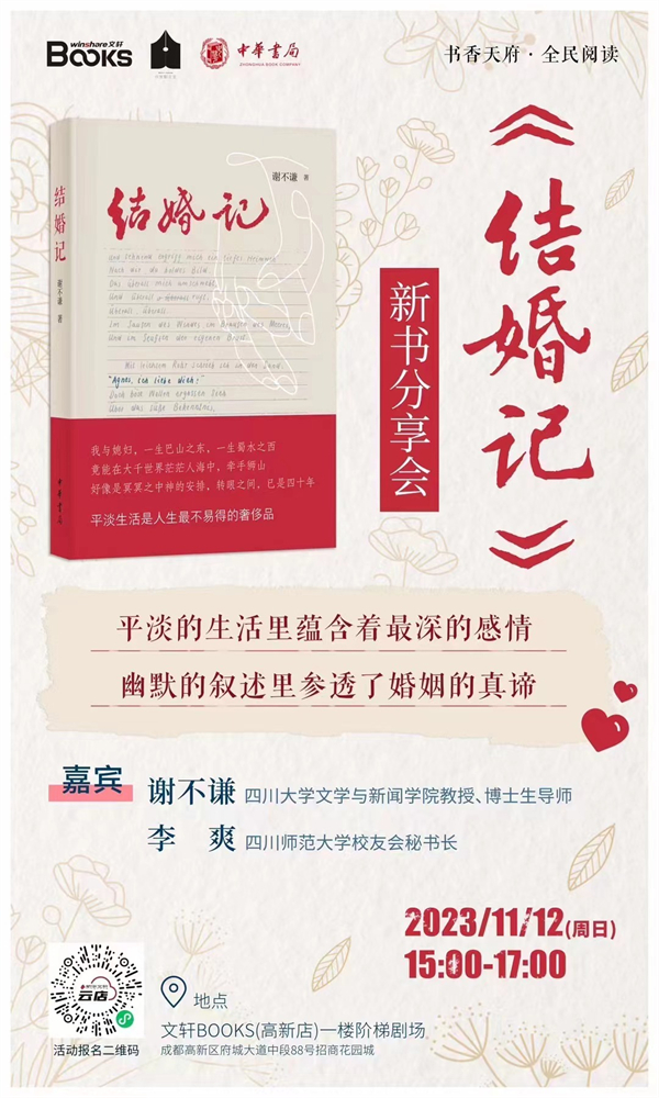 11月12日,我们邀请到四川大学教授谢不谦、四川师范大学校友会秘书长李爽,做客文轩BOOKS高新店,围绕《结婚记》以川式幽默讲述最深的感情和婚姻的真谛。