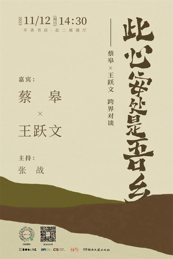 家乡不仅是地理的概念,更是人们安放情感的心灵归处。蔡皋与王跃文作为湖南土生土长的作家,故乡的风土人情始终贯穿在他们的创作当中。无论文字还是绘画,他们的作品都是重拾乡土田园和传统文化美与善的用情之作。11月12日,蔡皋和王跃文将来到不吝书店,围绕“此心安处是吾乡”这一命题,就各自的作品进行一次艺术家们之间跨越文学与绘画的真诚对话。