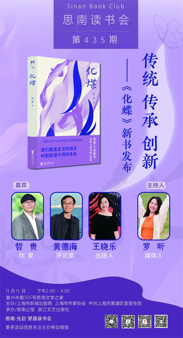 在高速频繁,让人应接不暇的信息化的今天,“回归传统”“重塑传统”的讨论显得有些困难却重要。衔接过去与当下,勾连传统与现代,提出的理论需要具体的实施方案。而《化蝶》希望以此为题,给出一种思考和可能。小说围绕一次越剧改编展开,牵连出两代越剧表演家之间的师承与角力,也联系起演员与观众这一体两面。作者哲贵并非第一次将眼光看向越剧。而这一次,除了越剧之外,他更关注到了以越剧为代表的传统文化在当下的蝶变。11月11日下午,哲贵带着他的新书《化蝶》来到思南读书会,与黄德海、王晓乐畅谈《化蝶》和它背后的传统与当代。