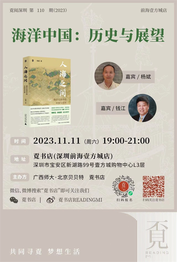 谈到古代中国,人们通常会想起草原和马的故事。但容易被忽略的是,古代中国也有大海与船。中国人曾经踊跃参与亚洲海洋的开拓与交流,一度是穿越南海和印度洋的中坚力量。那么,一个拥有2000年海洋交流史的海洋大国,为何在近代百年中陷入海洋的沉寂?11月11日,香港城市大学教授杨斌将携新书《人海之间》,与曾任《海交史研究》主编的香港大学教授钱江,一起做客覔书店(壹方城店),透过历史的维度,为读者朋友们讲述“海洋中国”的故事。