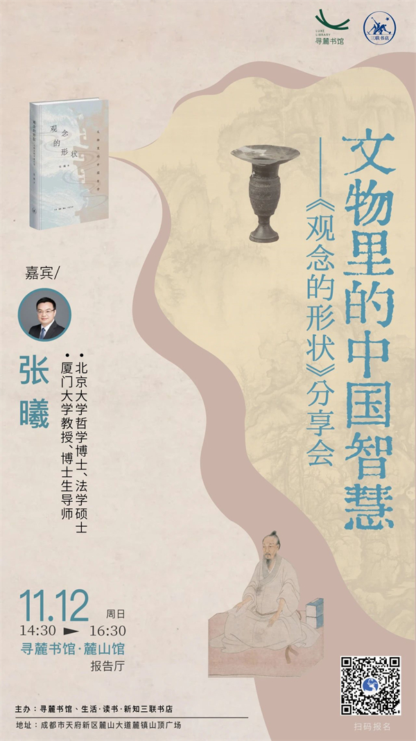 如果文物会说话,它们会告诉我们什么?除了可以鉴定年代的材质,可以赏析感受的艺术形式,可以遥想的历史和故事,还有什么需要我们聆听的信息?11月12日,厦门大学教授、博士生导师张曦将携《观念的形状》做客寻麓书馆,从文物出发揭示千年历史的流变: 中国人经历过哪几次巨大的文化飞跃?它们如何反映在物质实体之上?中国古人在不同的时期如何理解天人关系?这些传统的智慧对我们今天的生活又有何启示?